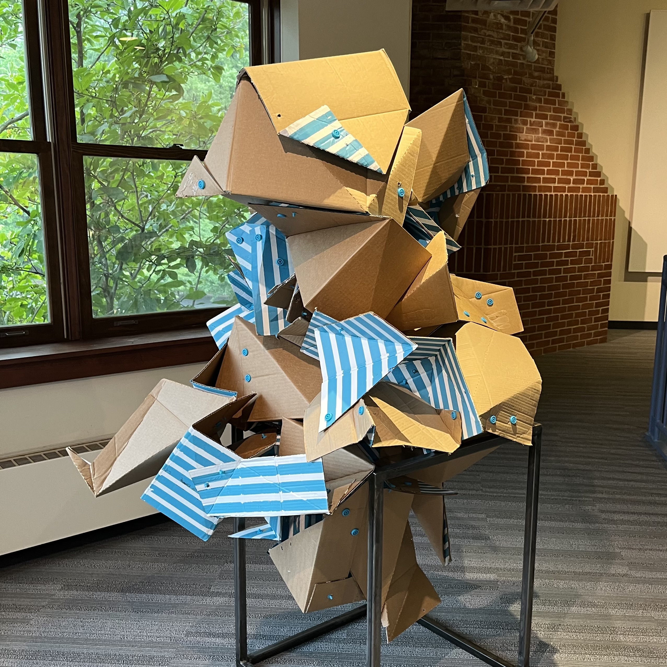 The sculptures are constructed from cardboard packages delivered to Owad’s home between January and June 2024.